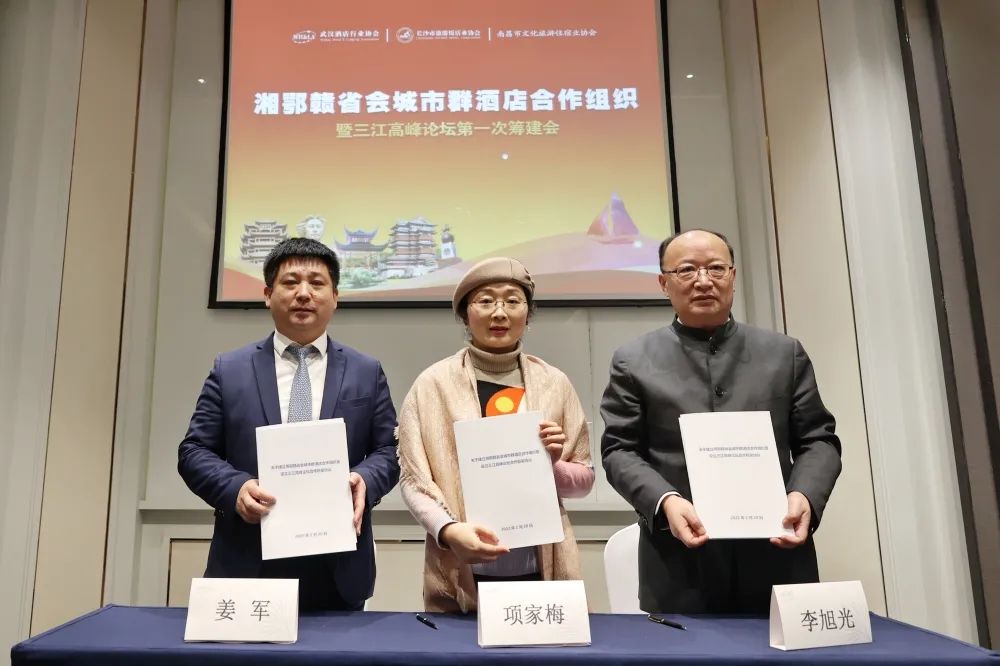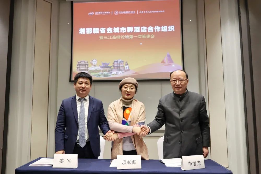 经过详细的探讨,三位会长成功签订关于建立湘鄂赣省会城市群酒店合作组织暨设立三江高峰论坛合作框架协议,三江协会共建合作正式开启。