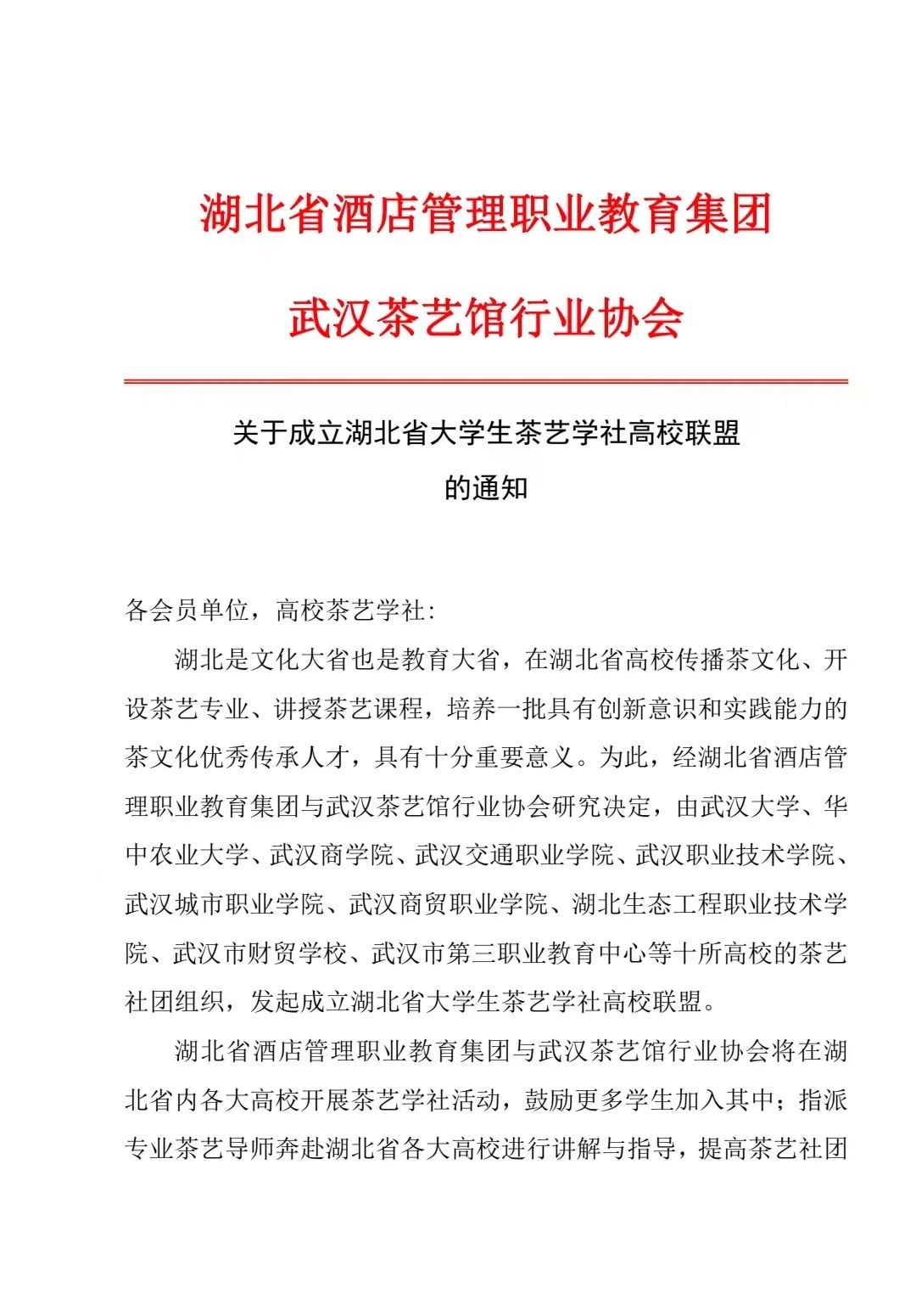 湖北是文化大省也是教育大省,武汉在读大学生被称为全世界之最,有近130万大学生,在湖北省高校传播茶文化、开设茶艺专业、讲授茶艺课程具有十分重要意义。为此,经湖北省酒店管理职业教育集团与武汉茶艺馆行业协会共同研究决定,由武汉大学、华中农业大学、武汉商学院、武汉交通职业学院、武汉职业技术学院、武汉城市职业学院、武汉商贸职业学院、湖北生态工程职业技术学院、武汉市财贸学校、武汉市第三职业教育中心等十所高校的茶艺社团组织,发起成立湖北省大学生茶艺学社高校联盟。