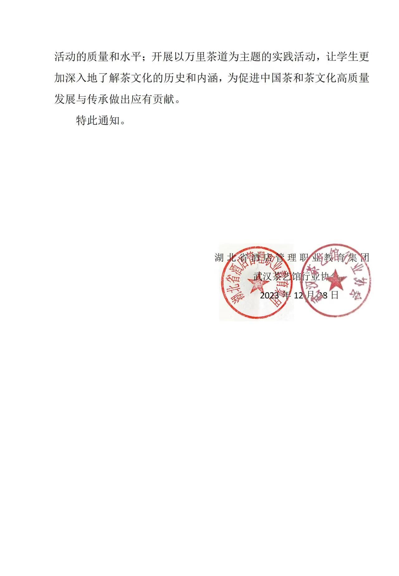 湖北省酒店管理职业教育集团与武汉茶艺馆行业协会将在湖北省内各大高校开展茶艺学社活动,鼓励更多学生加入其中;指派专业茶艺导师奔赴湖北省各大高校进行讲解与指导,提高茶艺社团活动的质量和水平;开展以万里茶道为主题的实践活动,让学生更加深入地了解茶文化的历史和内涵。