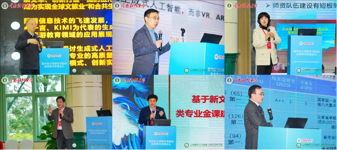 会议主旨演讲环节,湖北大学旅游发展研究院院长马勇教授,教育部高校旅游管理类专业教学指导委员会委员、东北财经大学萨里国际学院院长史达教授,云南大学工商管理与旅游管理学院院长赵书虹教授,教育部高校旅游管理类专业教学指导委员会委员、华南理工大学南方文旅产业研究院院长江金波教授,教育部高校旅游管理类专业教学指导委员会委员、武汉商学院旅游管理学院院长薛兵旺教授,云南财经大学旅游与酒店管理学院院长晏雄教授分别做了《生成式人工智能助力财经类旅游国家一流专业高质量发展创新》《AI赋能高等教育:融合与高质量发展》《应用型本科实践教学体系构建探索》《文旅融合政策创新研究与中国旅游学术话语体系建设》《基于新文科背景下旅游管理类专业金课建设的实践探索》《数智文旅现代产业学院政产学研协同育人机制创新与实践》主题报告。