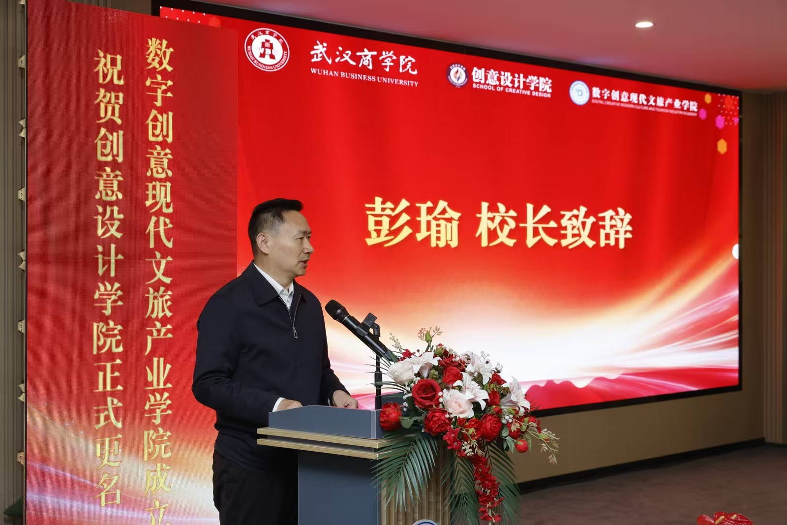 2025年12月25日,武汉商学院成立数字创意现代文旅产业学院。在揭牌仪式上,武汉商学院党委书记孟武康、校长彭瑜、教育部高等学校旅游管理类专业教学指导委员会副主任马勇、湖北省政府文史馆国学院院长刘玉堂、武汉市文化旅游集团副总经理周洁、武汉市文旅局一级调研员产业处处长彭胜、共同为学院揭牌。副校长陈磊主持本次仪式。