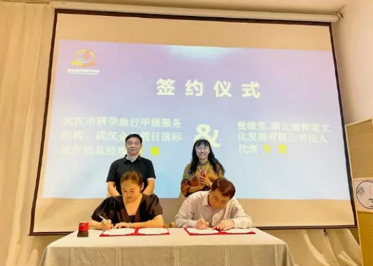 最后,参加活动的专家顾问和委员兴致勃勃的参观考察贵缘堂茶文化研学基地,积极参与相关项目的体验活动。考察体验前,湖北省研学导师专委会主任单位、武汉市首批研学旅行甲级服务机构、武汉金色假日国际旅行社有限公司总经理彭敏与贵缘堂茶文化研学基地总经理李慧签订了战略合作协议。
